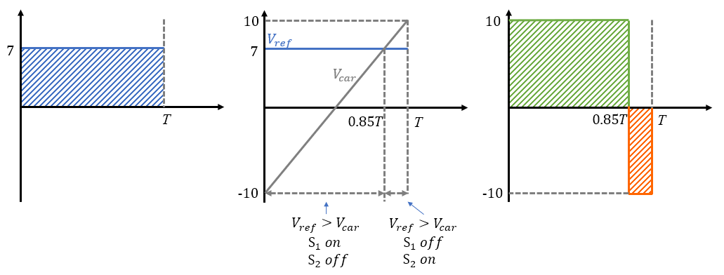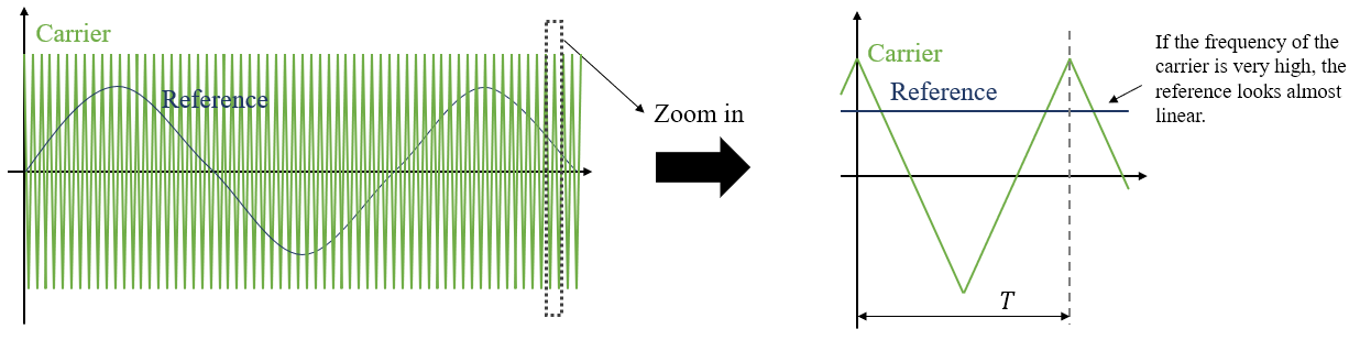 내가 출력하고자 하는 원하는 전압을 Reference 전압이란 의미로 Vref라 하고, -10V에서 10V까지 T 동안 선형적으로 변하는 전압을 Carrier 전압의 의미로 Vcar라 하자. 이 두 전압을 비교하여 Vref가 Vcar보다 큰 구간과 작은 구간으로 나누고, 각 구간을 S1 on, S2 off 와 S1 off, S2 on 동작을 하도록 하면 결국 위에서 설명한 예시와 동일한 출력을 발생함을 볼 수 있다. 만약 Carrier가 좌우 대칭이더라도 스위치가 on/off되는 순서만 바뀔 뿐 동일한 평균값을 얻을 수 있다. 따라서 보통 Carrier로 삼각파를 사용한다.