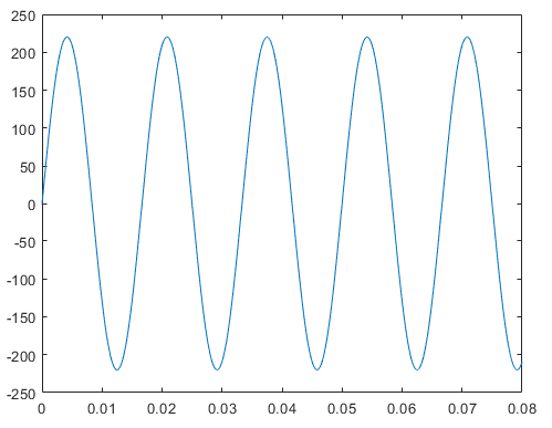 The t in the third row means to arrange from 0 seconds to 0.08 seconds at intervals of dt. Usually used as a value on the x-axis, which must be expressed in matrix (1 X n) for the x-axis value.