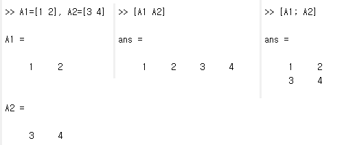 Conversely, if you want to combine the two matrices, you can tie them in square brackets as shown in "[Parallel 1 Matrix 2]." Likewise, if you want to change rows, you can also "[Parallel1; Matrix2]".