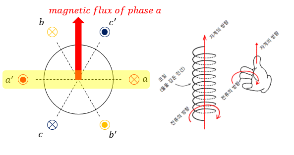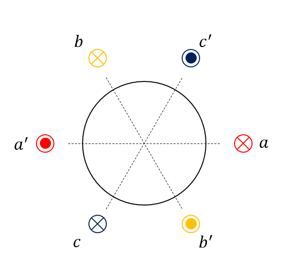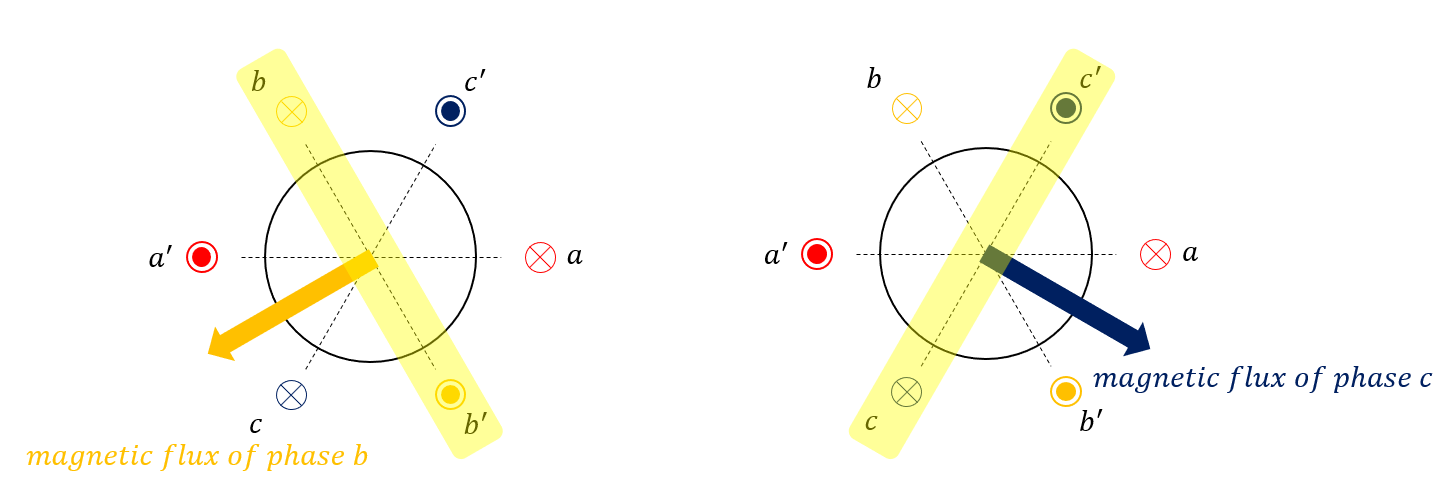 화면에 수직인 방향으로 a, b, c라 표시된 점에 전선이 각각 들어가 a', b', c' 점으로 감겨 나오는 것을 의미한다. 따라서 만약 a상에만 전압이 걸린다면 자속은 앙페르의 오른나사 법칙에 의해 이 전류 루프의 수직인 방향으로 발생할 것이다.