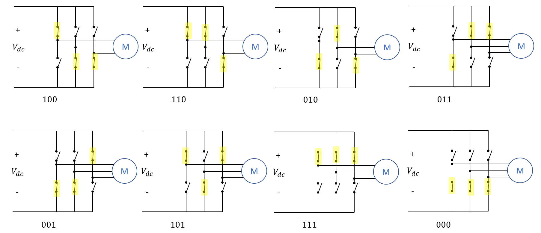 따라서 인버터의 스위치는 반드시 하나가 켜지면 하나는 꺼지는 상보적인(complementary) 움직임을 보여줘야한다. 이 점을 유의하면 인버터가 보여줄 수 있는 스위치 동작은 다음과 같이 8가지의 경우의 수가 있다. (물론 모든 스위치가 꺼진 경우도 있지만 그 특성은 다음 번에 따로 다루도록 하겠다.) 편의를 위해 브릿지마다 스위치 패턴을 0과 1로 표현하여 위 그림 밑에 적힌 것과 같이 벡터로 스위치 상태를 표현하겠다. 이를 공간전압벡터라고 하며, 브릿지의 윗쪽 스위치가 켜지면 1, 아랫쪽 스위치가 켜지면 0으로 한다.