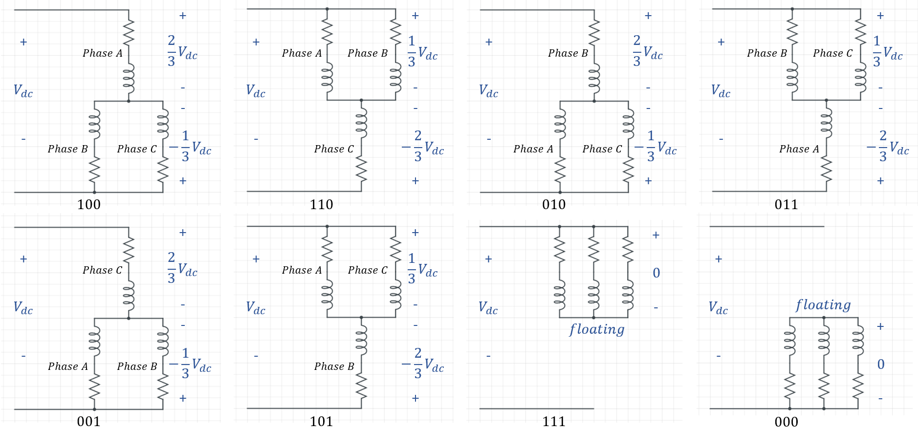 여기서 111과 000은 조금 특이하게 고정자의 모든 상이 모이는 중성점이 floating 상태(노드가 아무 것도 연결되지 않은 상태)가 되기 때문에 모든 상에 전압이 걸리지 않는다. 따라서 이 두 벡터를 영전압벡터라고 부르며 나머지 벡터를 유효벡터라고 한다.