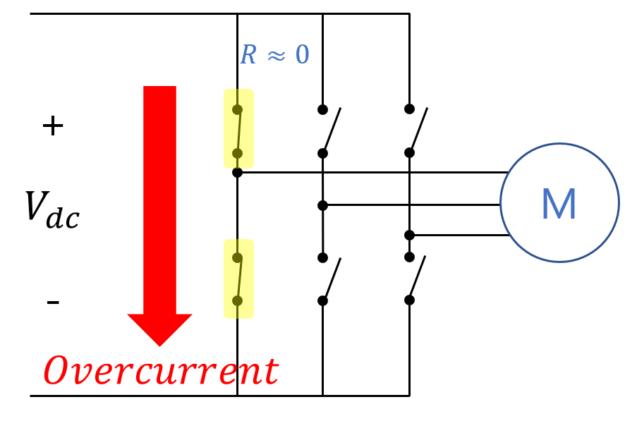 인버터는 기본적으로 한 브릿지에 모든 스위치가 켜지면 단락(short)이 발생하여 엄청난 과전류가 흐르게 된다.