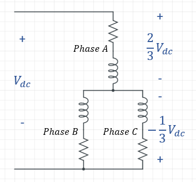모터 고정자의 상 하나는 RL 부하로 생각할 수 있으며, 전압 분배법칙에 의해 a상에는 2/3 Vdc 만큼의 전압이, b와 c상에는 -1/3 Vdc 만큼의 전압이 걸리는 것을 알 수 있다. 마찬가지의 방법으로 다른 스위치 패턴에서도 각 상에 걸리는 전압을 구할 수 있다.