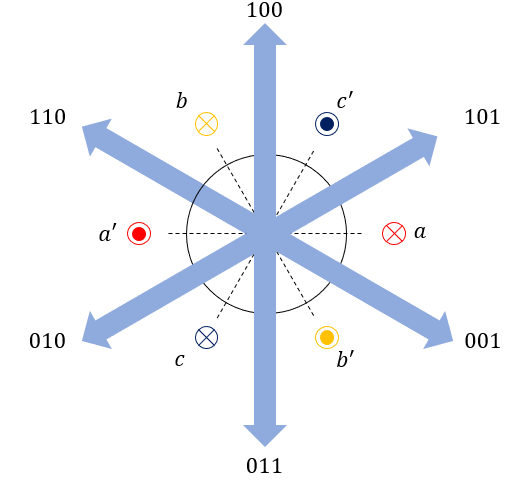 최종적으로 12시 방향으로 ɸ 만큼의 자속이 발생함을 알 수 있다. 마찬가지로 한 번 더 110인 상황에서 자속을 분석하면, a, b, c상의 전압은 각각 1/3 Vdc, 1/3 Vdc, -2/3 Vdc이므로 다음과 같다.
